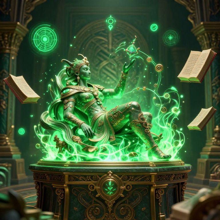 Ancient varita resting on an ornate altar, pulsating with vibrant green magical energy, surrounded by floating spell books and arcane symbols, richly detailed fantasy environment, dramatic lighting highlighting mystical ambiance, high-definition art style