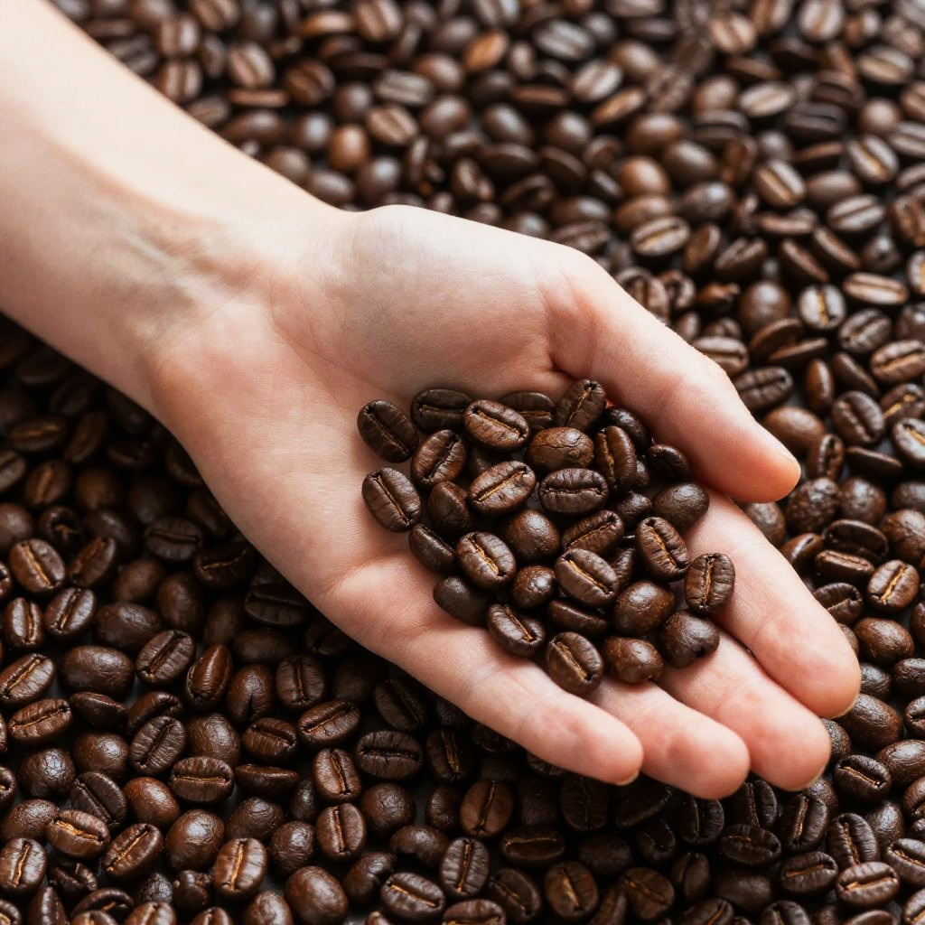 Close-up image of a pale human hand gently cupping a small pile of dark, shiny roasted coffee beans. The background is filled with a uniform layer of glossy brown coffee beans, highlighting their smooth texture and rich color.