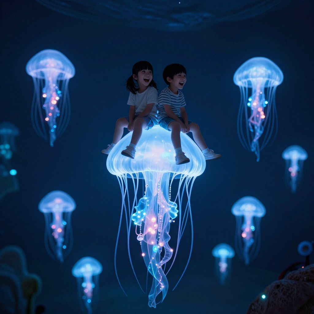 Amidst the ethereal glow of bioluminescent laughter, children perch atop a giant jellyfish, navigating an underground labyrinth where the weightless serenity of exploration intertwines with the boundless wonder of imagination.