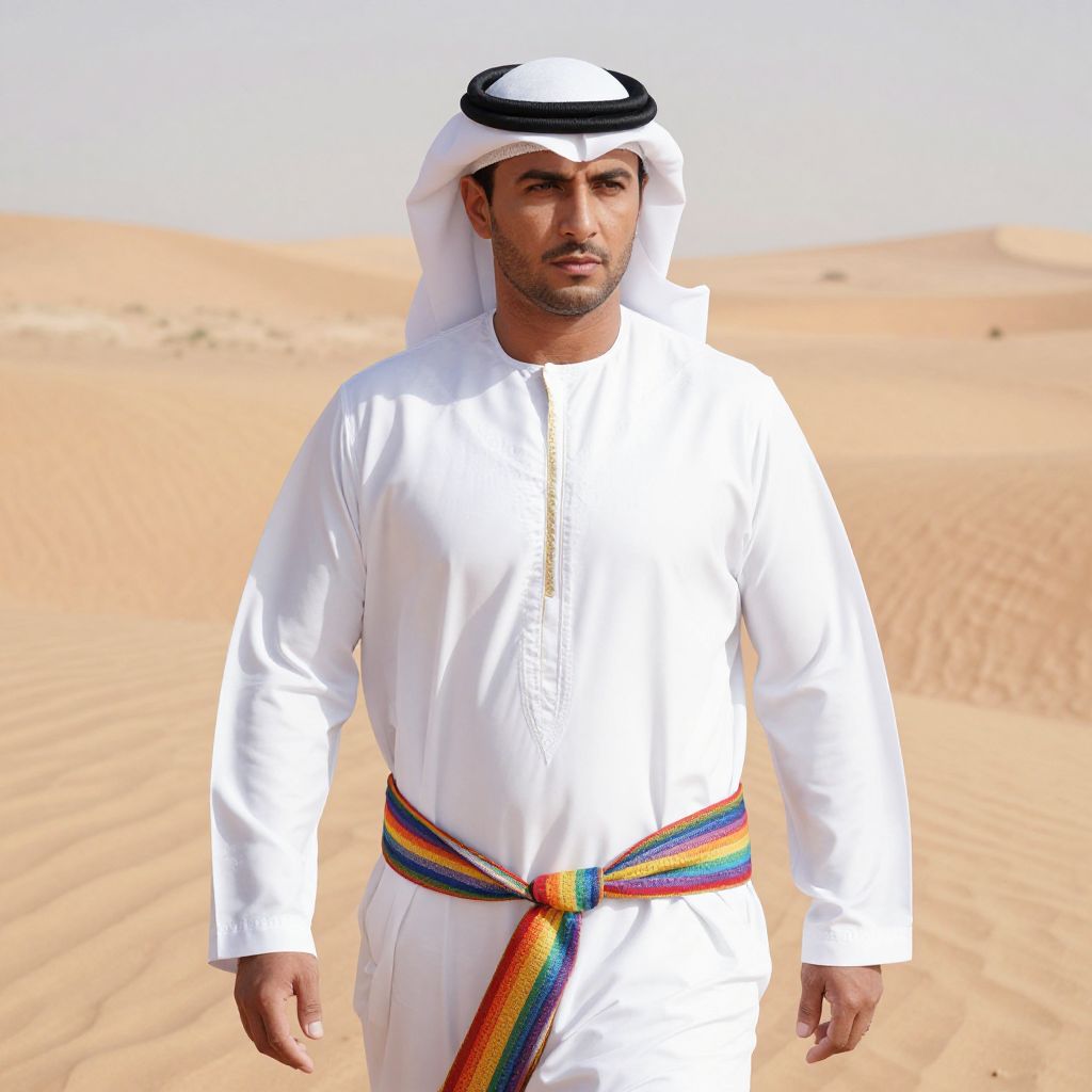 Photorealistic image of a handsome Middle Eastern man with dark hair, wearing a white traditional thobe with gold trim and colorful rainbow-striped sash, and a white keffiyeh on his head. He has a serious expression and is walking through a sunlit desert with dunes in the background. The bright sunlight casts shadows on his face and clothes.