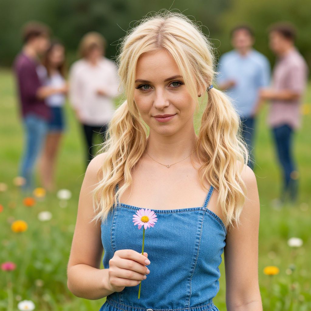 Photograph of a blonde woman with wavy pigtails, wearing a blue denim spaghetti strap top and holding a pink daisy. She's standing in a grassy field with colorful flowers, blurred group of friends in the background. She's smiling subtly, with a delicate necklace around her neck. The setting is bright and sunny, with a relaxed, casual vibe.