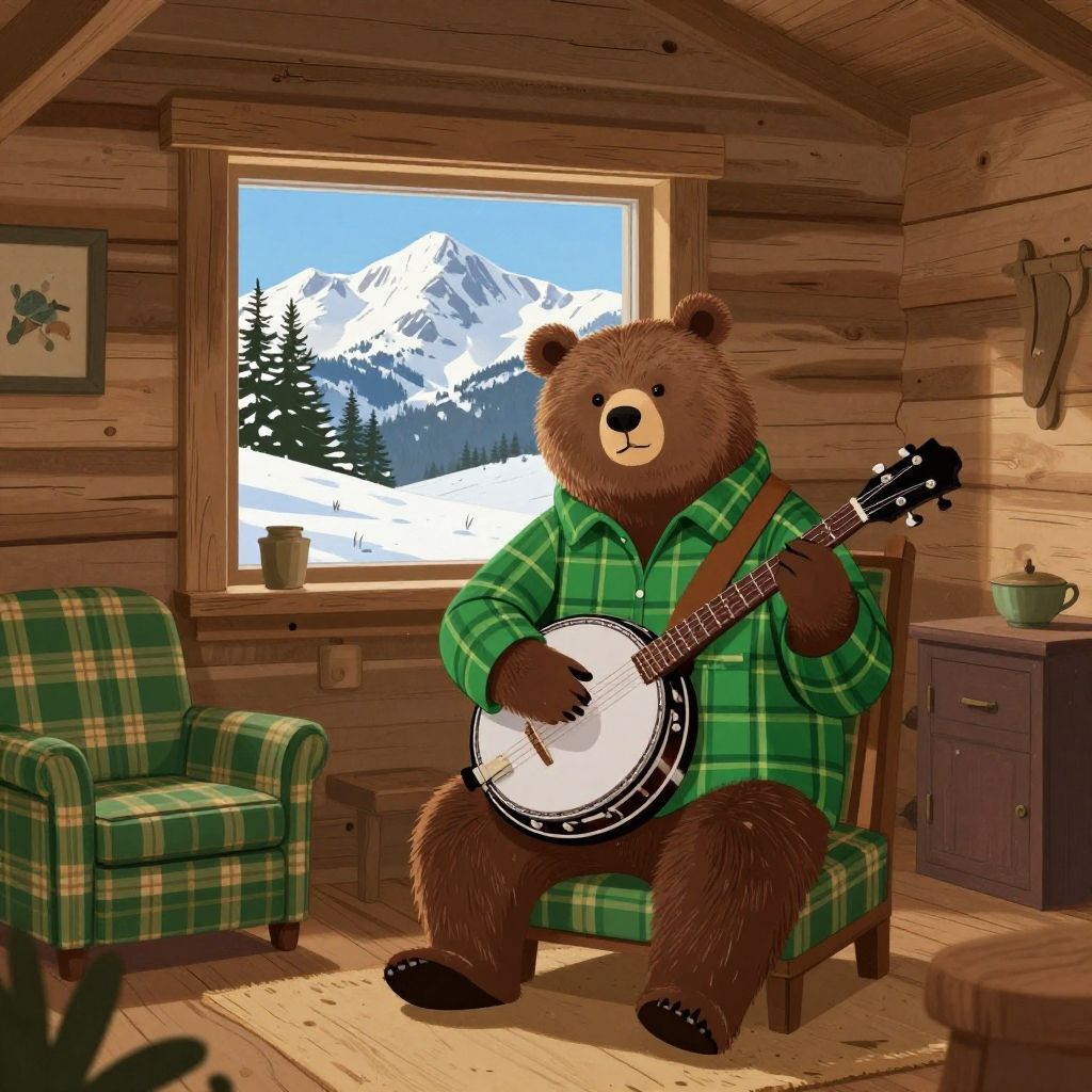 Illustration of a bear wearing a green plaid shirt playing a banjo inside a cozy wooden cabin. The cabin features rustic furniture in matching plaid patterns, a window with a scenic view of snowy mountain peaks, pine trees, and a clear blue sky.