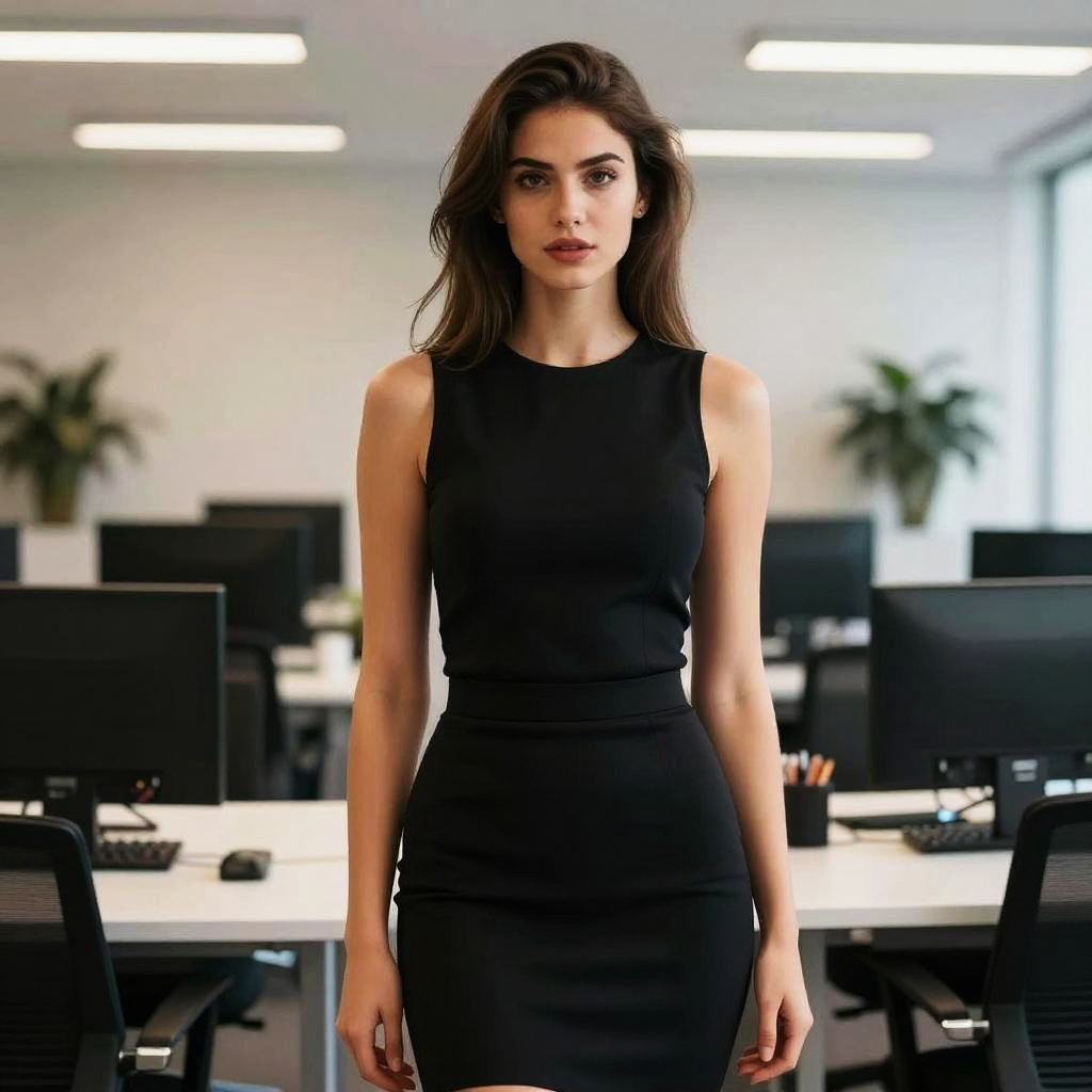 Photograph of a beautiful young woman with long, wavy brown hair and light skin, standing against a rustic wooden log wall. She's wearing a sleeveless, form-fitting black dress that highlights her slender figure. Her makeup is natural with a subtle pink lip. The wooden background has visible knots and grains, adding a warm, textured feel to the image.