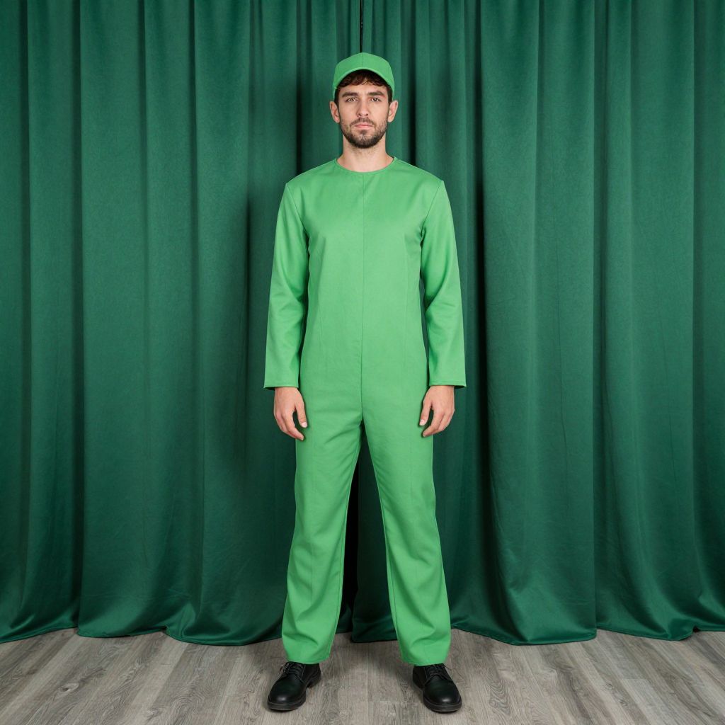 Photograph of a man standing against a dark green curtain backdrop. He is wearing a green jumpsuit and matching green cap, with black shoes. His hands are relaxed by his sides and he has a trimmed beard and short hair. The jumpsuit is plain with no visible logos or text. The floor is light gray wood. The man's expression is neutral, and he is centered in the frame, facing the camera directly. The lighting is even, highlighting the green color of his outfit and the curtain behind him.