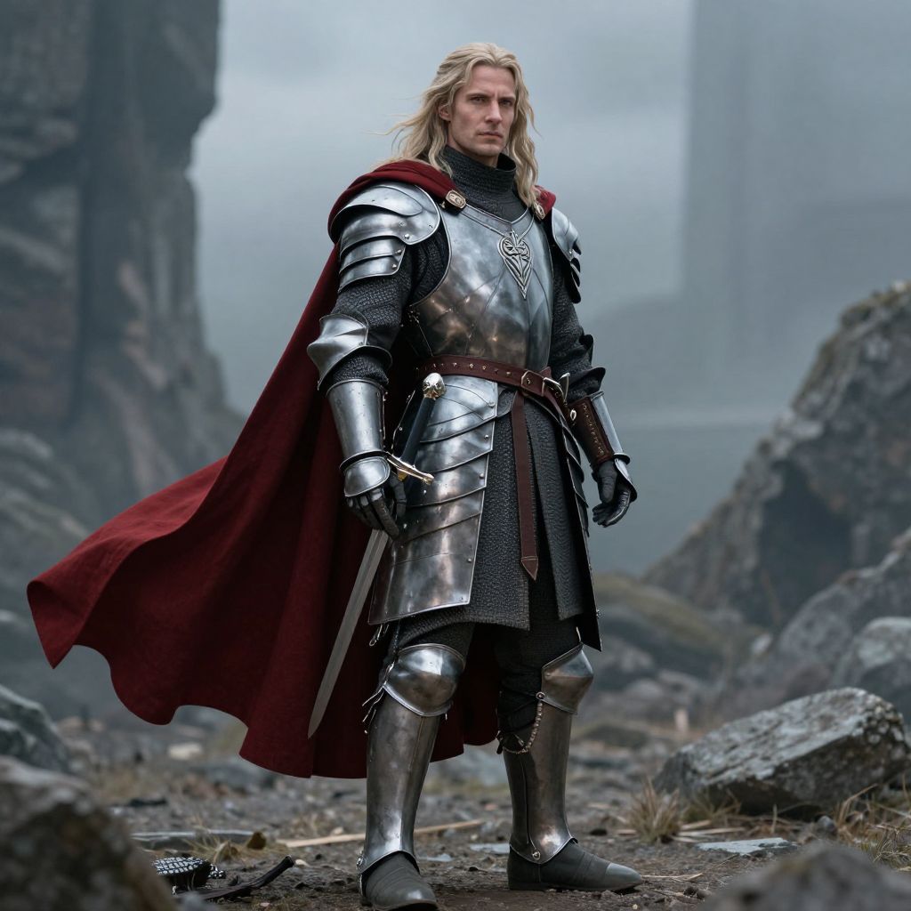 Faramir outfit, man in armor with a sword and a red cape