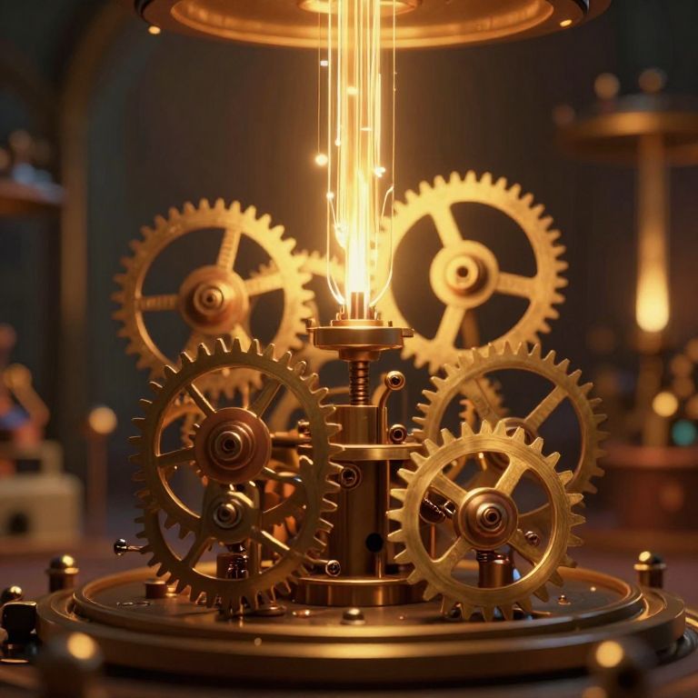 Craft an image depicting a close-up view from inside the intricate gears and cogs of an antique mechanical device, as they gracefully rotate in a mesmerizing ballet with time. This scene unfolds within a dimly lit chamber where soft, golden light emanates from glowing filaments, bathing the mechanisms in an ethereal glow that evokes a sense of mystery and wonder. The digital artwork seamlessly blends elements of precision engineering with whimsical dreamscapes, capturing the delicate interplay between reality and fantasy reminiscent of surrealist art. This captivating visual experience invites viewers to explore the hidden dance of mechanical marvels within our world, creating an atmosphere that is both enchanting and thought-provoking.