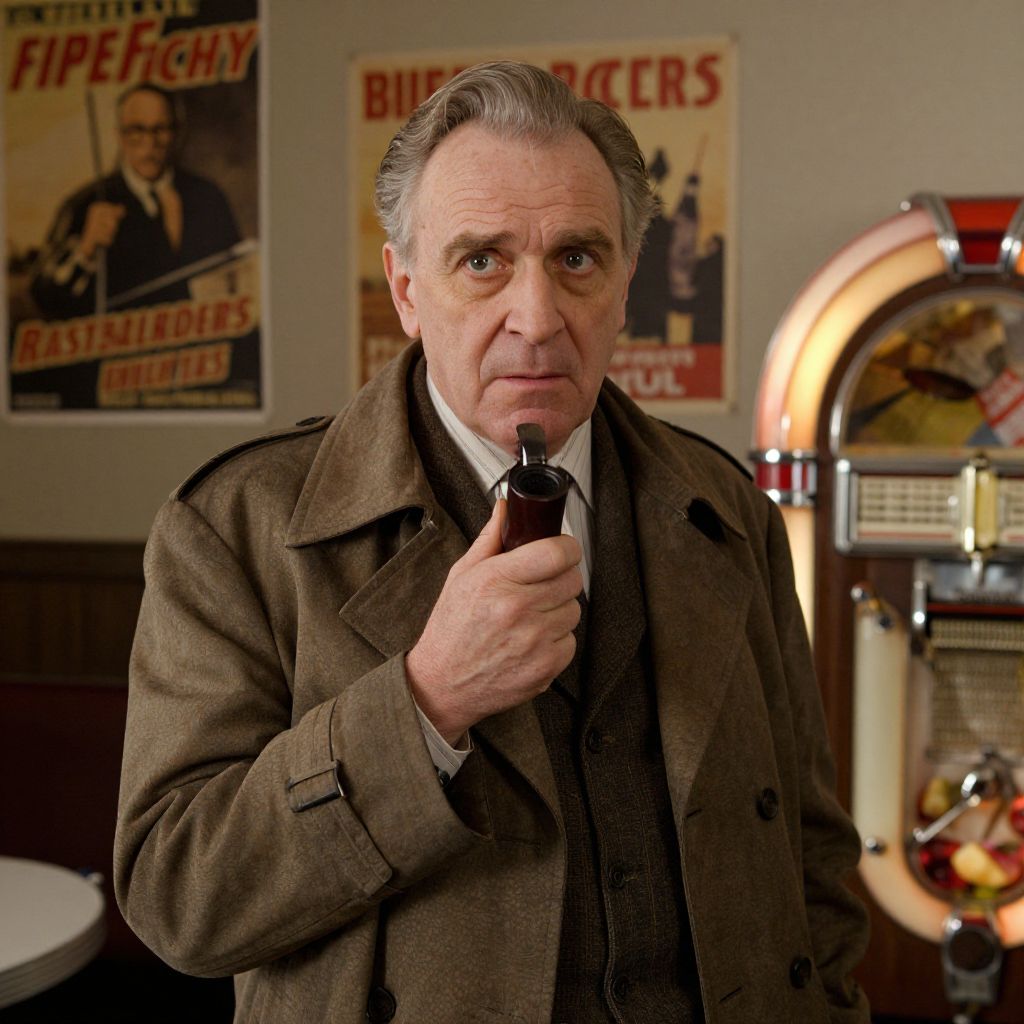 A realistic portrait of an older man in a classic movie character costume from the 1950s, dressed as a detective with a worn trench coat, a pipe in one hand, standing in a dimly lit vintage diner with vintage posters and a jukebox playing music, his face is weathered with a thoughtful expression, gray hair slightly wispy, deep-set eyes showing wisdom and mystery.