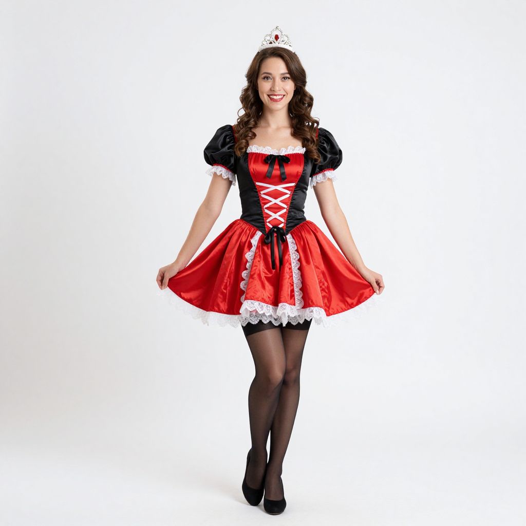 This is a brightly colored photograph of a smiling woman in a Cinderella-inspired costume. She's wearing a red and black dress with puffed sleeves, white lace trim, and a crisscrossed corset front. She has black stockings, black high heels, and a small tiara on her head. Her brown hair is styled in loose curls. The background is plain white, making her costume stand out vividly.