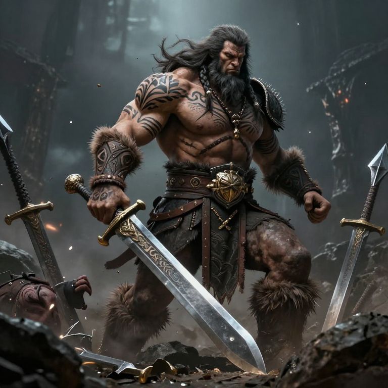 Digital artwork of a muscular, bearded barbarian warrior with tattoos, fur armor, and three gleaming swords, standing in a dark, battle-s