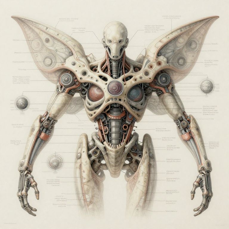 Bauplan inspired biomechanical organism layout, merging anatomy and engineering with precise labeled parts, emphasizing symmetry and complexity, art style combining technical drawing with surreal sci-fi aesthetics, soft lighting, detailed textures.