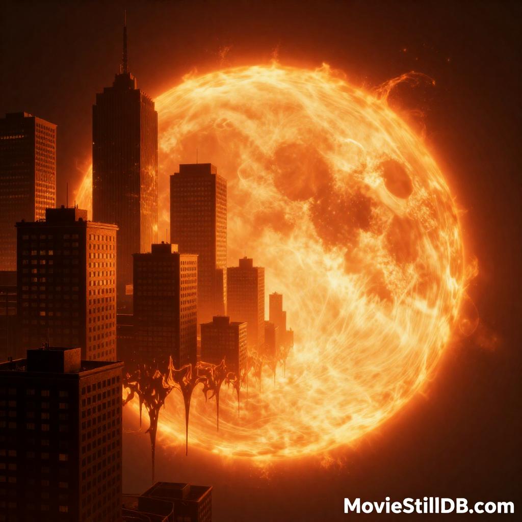 Digital artwork of a cityscape engulfed by a bright, fiery orange sun. The city's dark, cube-like buildings are on the left, gradually melting into the intense, glowing sun on the right. The sun's surface is ured with bright, radiant patterns. The artist's name, "MovieStillDB.com," is in white on the lower right.