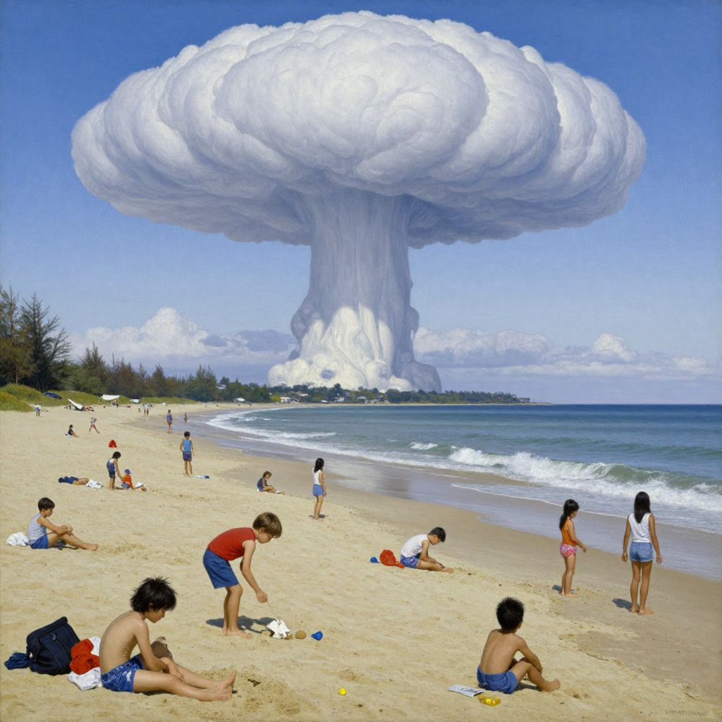 Photograph of a beach with people sunbathing and playing, under a massive, surreal cloud resembling a mushroom cloud. Clear blue sky and ocean in