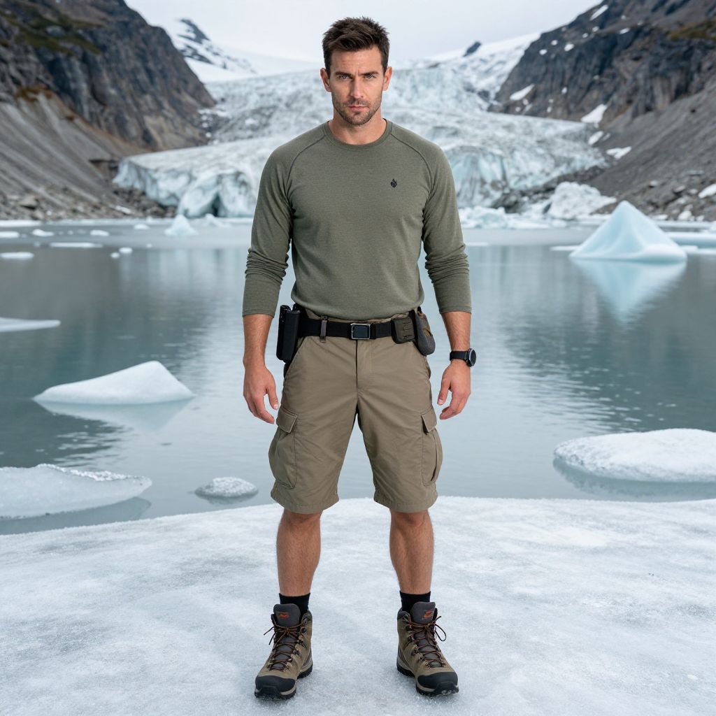 A man, olive green long-sleeve shirt, quick-dry cargo shorts, durable hiking boots, utility belt with pockets, glacial lakes, reflective surfaces, scattered ice fragments, cameraphone style, focused expression, ready for adventure. Man has masculine face and piercing eyes