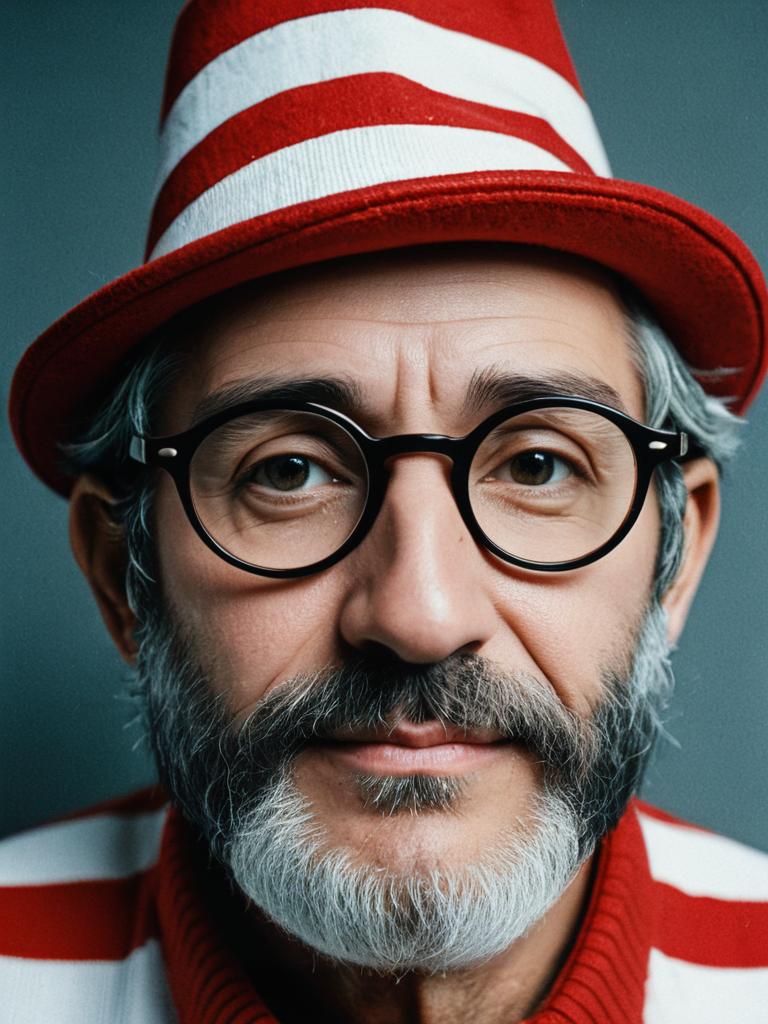 Man in Waldo costume, close-up detailed headshot with glasses and hat