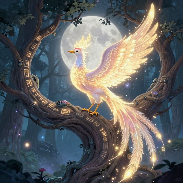 Digital illustration of a radiant, glowing white phoenix perched on a curved, ancient tree with a Greek key pattern. The phoenix, with intricate feathers and a long, flowing tail, is illuminated by a bright full moon in the background. The forest is dark and mystical, filled with twinkling fireflies and subtle, ethereal light. The tree's bark is textured, and small purple flowers adorn its branches. The overall scene is magical, with a blend of fantasy and nature, featuring vivid colors and detailed, whimsical artistry.
