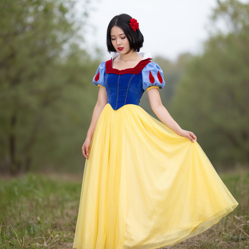 Photograph of an Asian woman with fair skin and short black hair adorned with a red flower, dressed as Snow White. She wears a blue bodice with red accents, puffed white sleeves, and a voluminous yellow skirt. She stands outdoors in a grassy field with blurred green trees in the background. Her red lips and closed eyes give her a serene expression. The lighting is natural, highlighting her delicate features and the vibrant colors of her costume. The overall style is reminiscent of classic Disney animation.