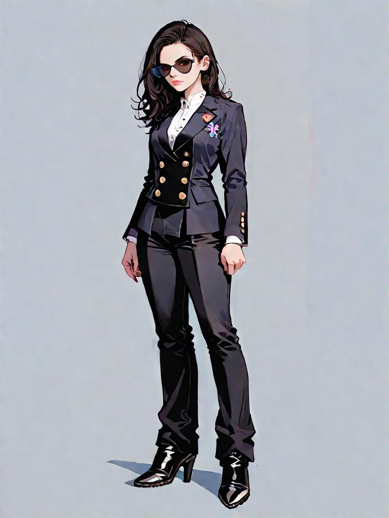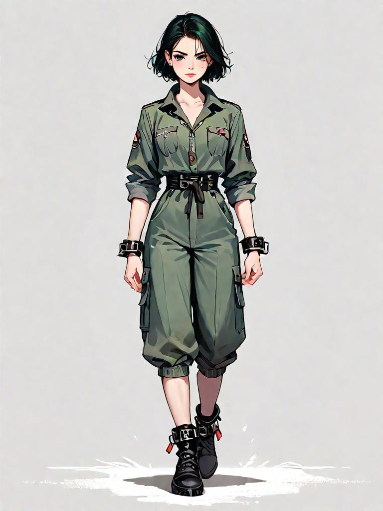 1girl, source_comics, realistic face, full body shot, Woman, casual streetwear, black fuzzy sweater, loose fit, camouflage cargo pants in shades of green, brown, and black, cuffed hems, silver grommet belt with double-prong buckle, black ankle boots with pointed toe, white studio background.
