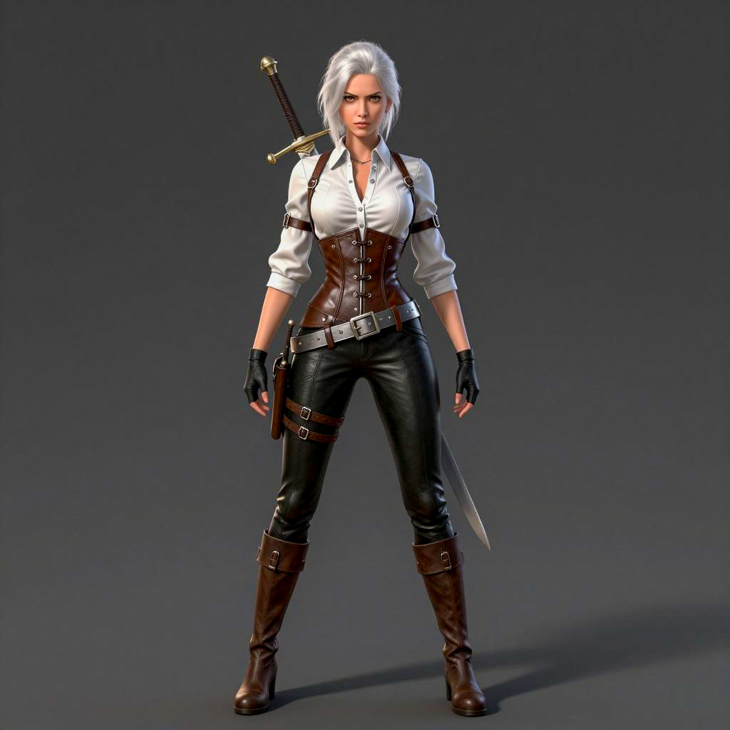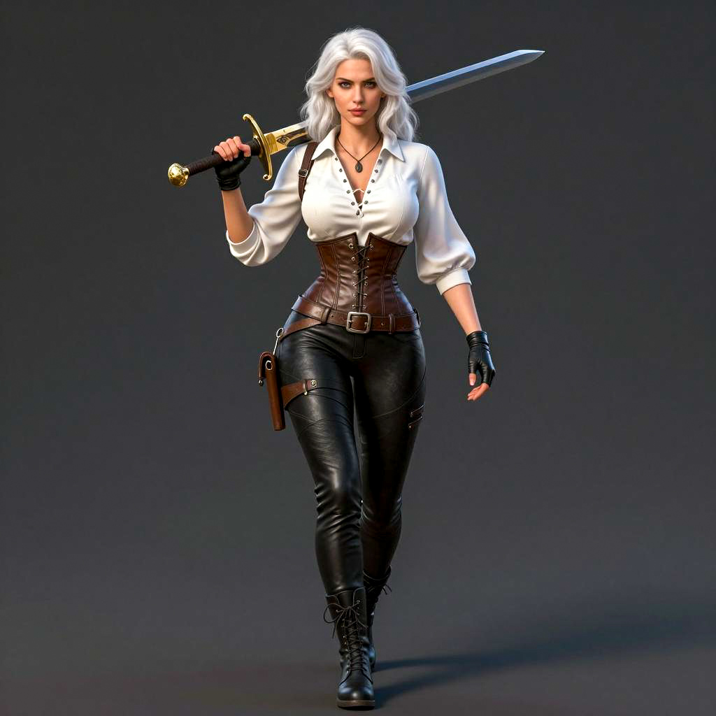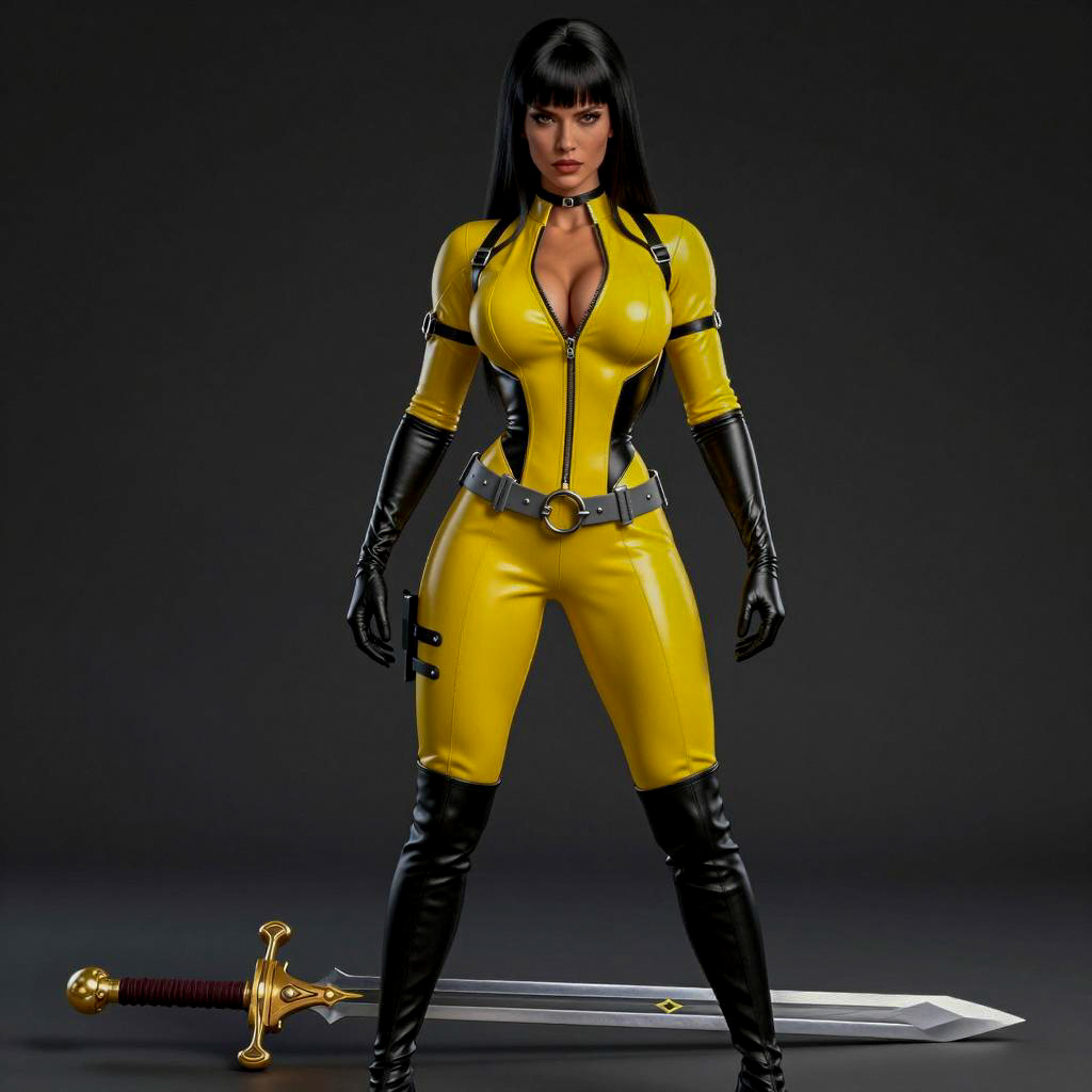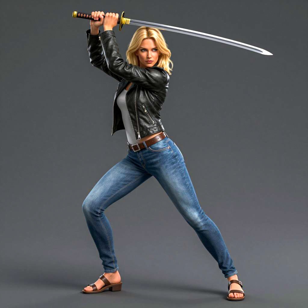 Illustration of a blonde woman with medium-length hair holding a katana above her head with both hands. She is wearing a black leather jacket, gray top, blue jeans with a brown belt, and brown sandals. The woman stands in a dynamic stance with feet apart and eyes focused on a dark gray background.