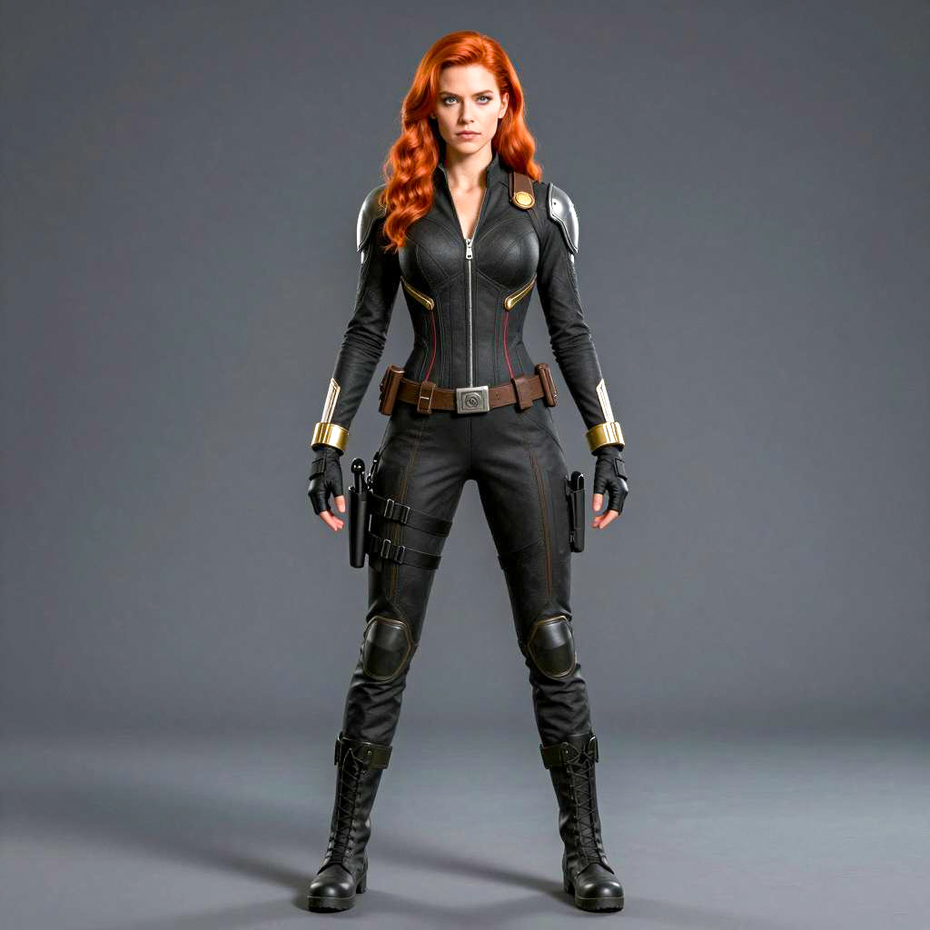 Blonde woman with medium-length hair, holding a katana above her head with both hands, wearing a black leather jacket, blue jeans, brown belt, and brown sandals. Dark gray background. Dynamic stance, feet apart, eyes focused. Illustration.