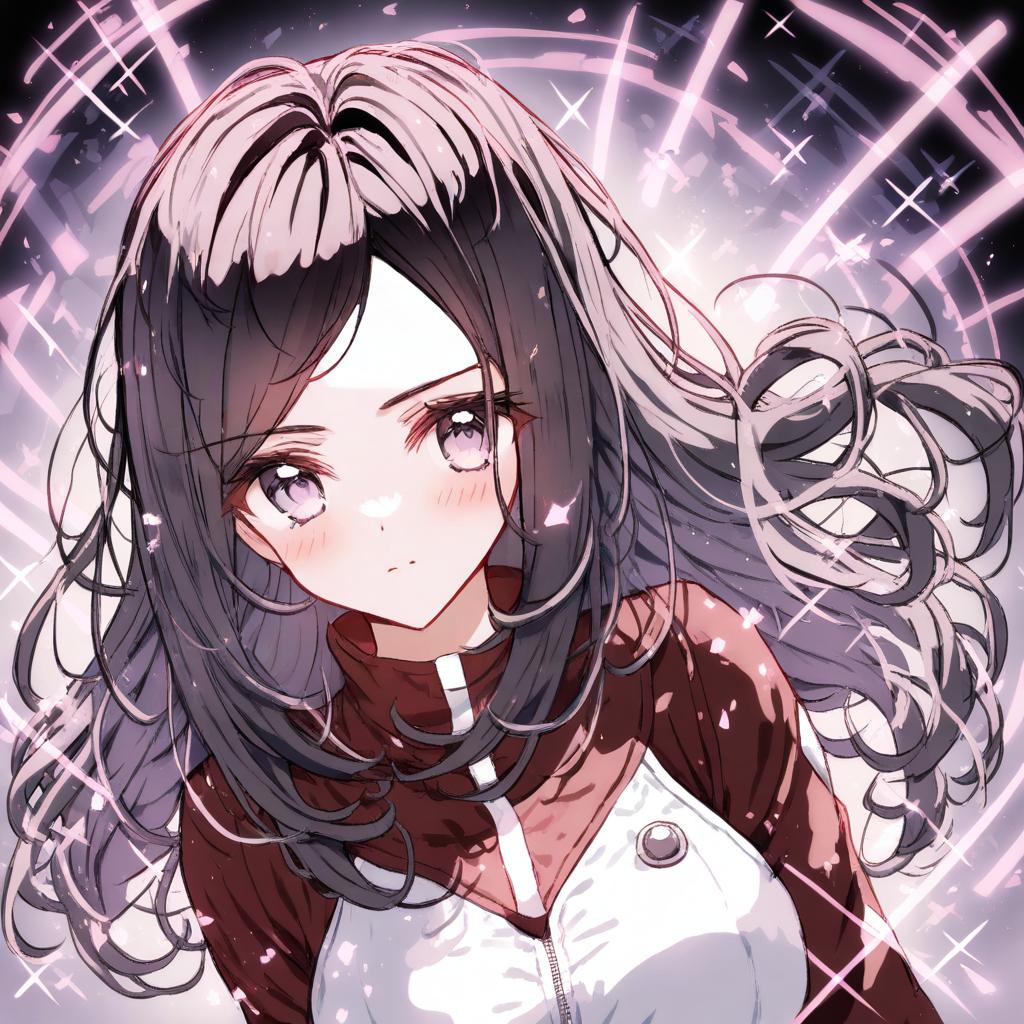 Digital anime-style illustration of a young woman with long, flowing black hair and medium length with soft curls. She has striking purple eyes and subtle lipstick. The character wears a red and white jacket with a high collar and zipper detail. The background features dynamic, abstract pink and white light effects that enhance the vibrant and stylish composition.