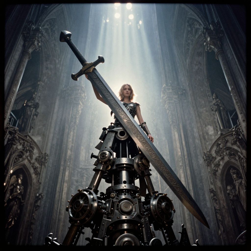 Analog film photo art by Zdzislaw Beksinski, baroque style, gothic, young woman KTNK, mechanical, giant cyberpunk sword, epic, glorification, backlit, god rays, faded film, desaturated, 35mm photo, grainy, vignette, vintage, Kodachrome, Lomography, stained, found footage
