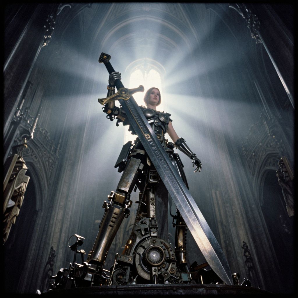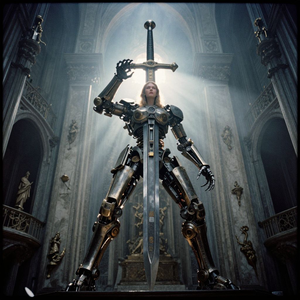 Photorealistic CGI: A robotic woman with metallic limbs stands in a dark, gothic cathedral, holding a glowing sword, illuminated by ethereal light