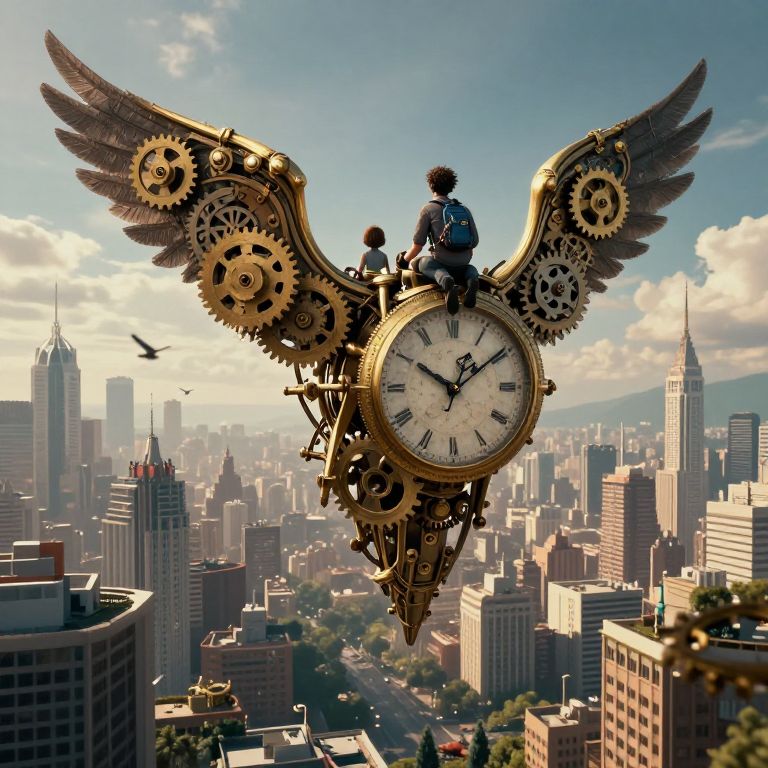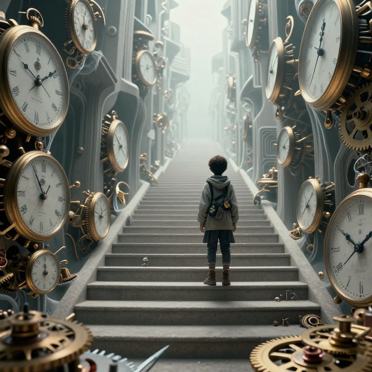 Digital art: A child in a gray hoodie stands on a stairway flanked by towering, gold clock faces, surrounded by gears, ascending into a