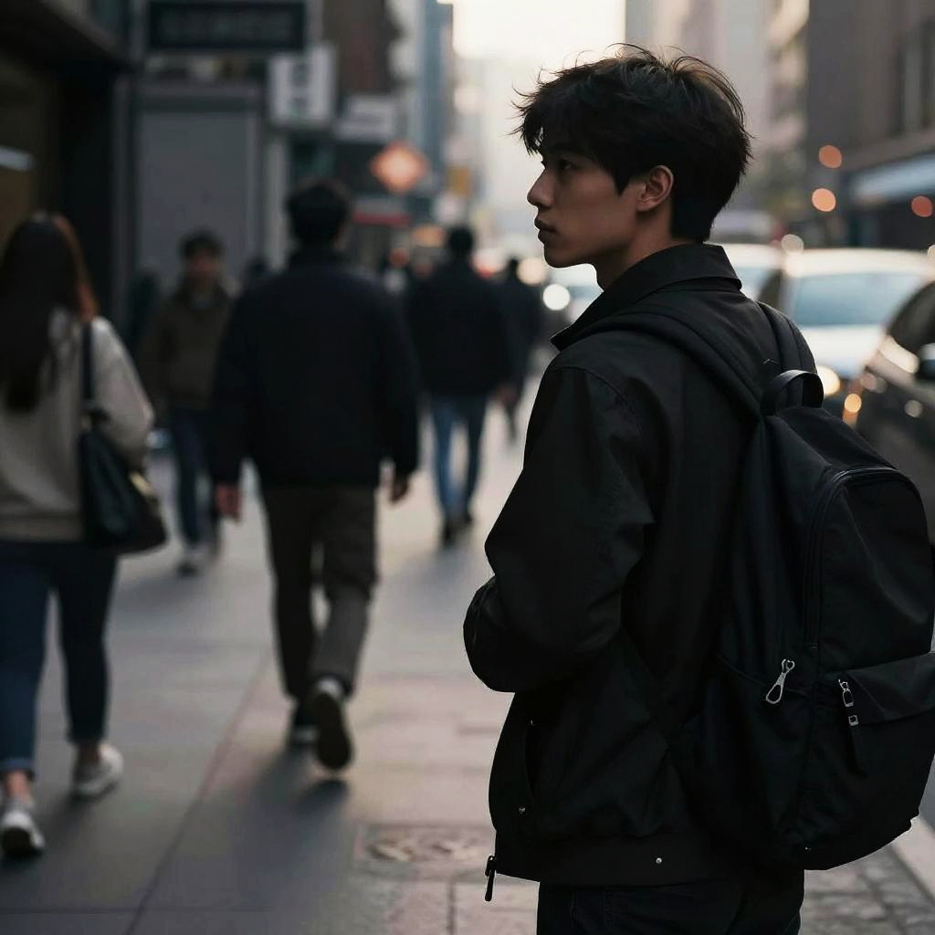 Avoidant eye contact, silhouette of a figure avoiding gaze in a busy urban setting, moody atmosphere, high contrast shadows, expressive body language, digital art