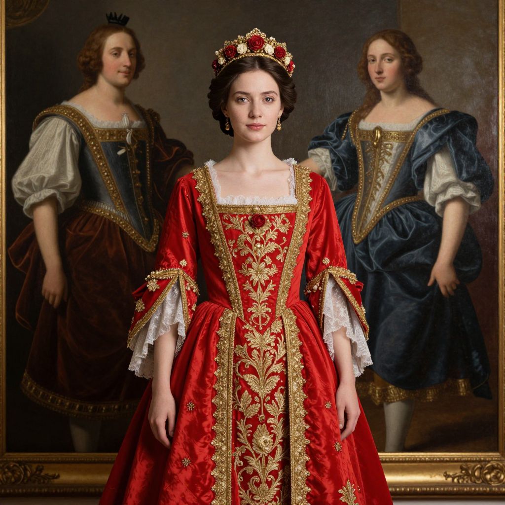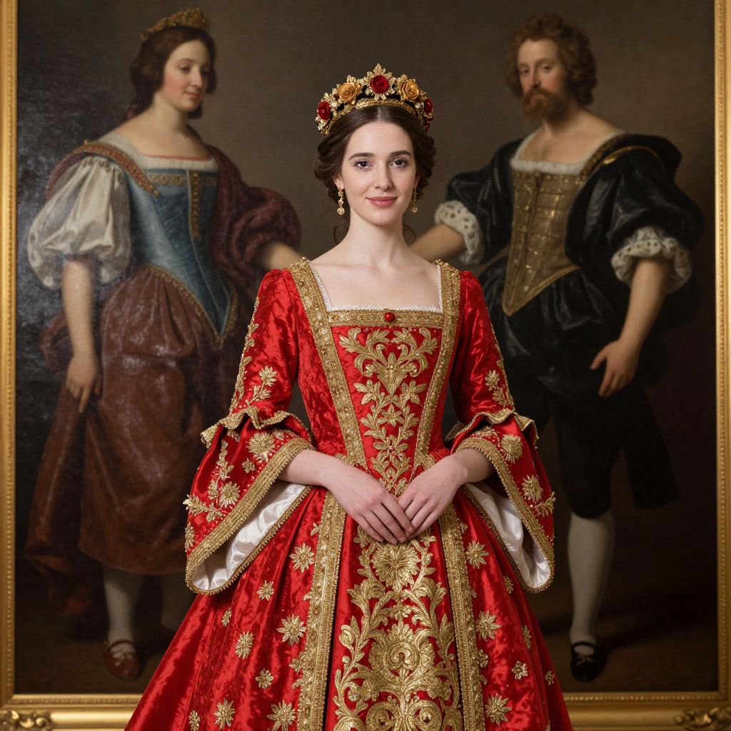 Photorealistic digital painting of a young woman with fair skin and dark hair, wearing an ornate, red velvet Renaissance-style gown with gold embroidery and white lace sleeves. She has a red and gold crown on her head. Flanking her are two men with similar fair skin and curly brown hair, dressed in blue and brown Renaissance outfits with gold trim and white lace. The background is a dark, textured wall. The overall style is classical, evoking the elegance of Renaissance portraiture. The central woman stands slightly forward, gazing directly at the viewer.