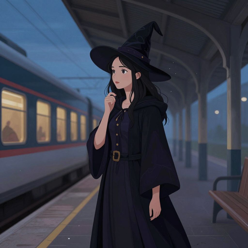 Embellishment young woman standing at a train station in the evening, secretly a witch, hints of magic in the air, mystical, mysterious and hopeful, dreamy illustration, chapter cover art,