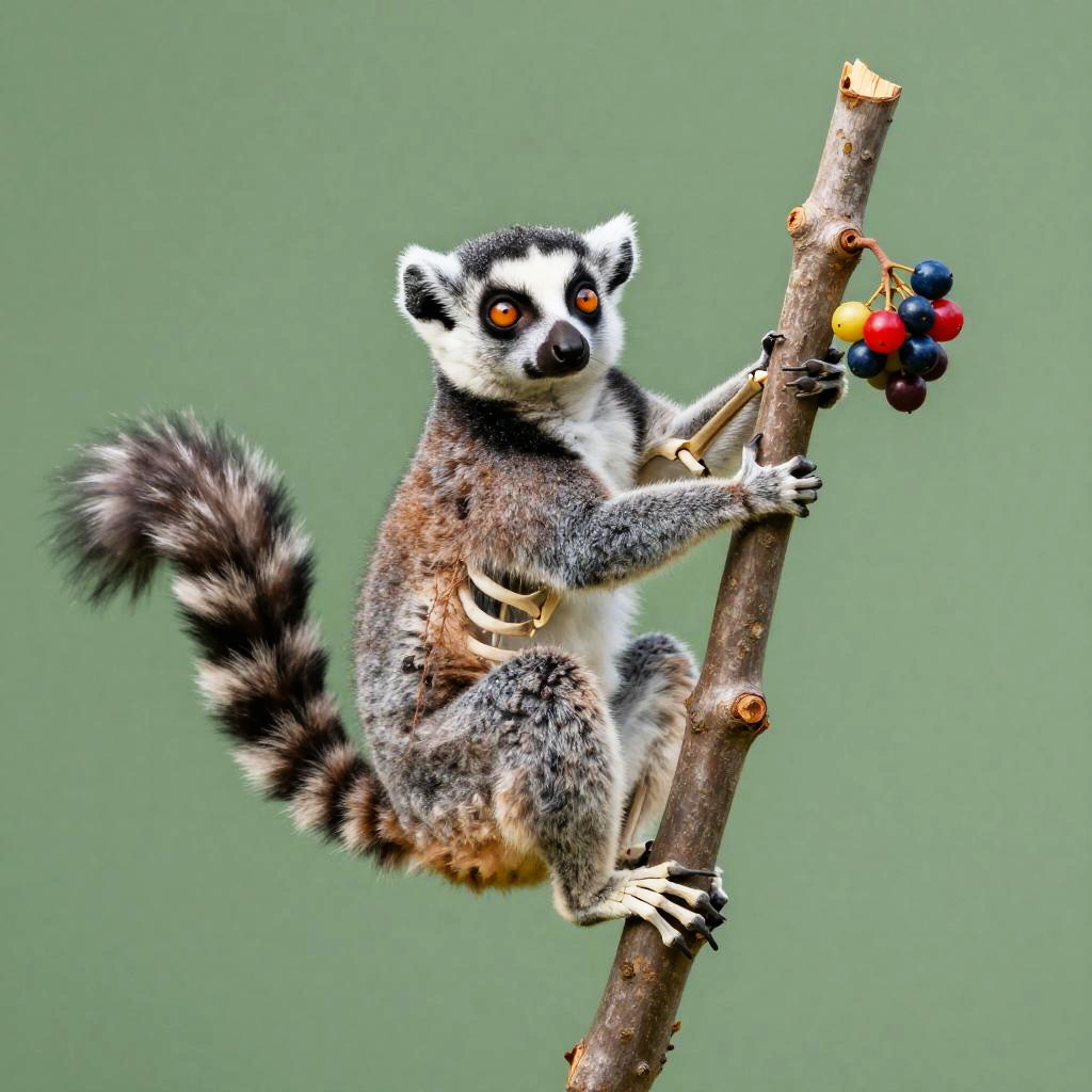 Full body, solo, anthropomorphic lemur with bushy striped tail and wide amber eyes, rabbit ears, skeleton, ribs, animal, climbing a thin tree trunk, grasping a bunch of colorful berries, green background