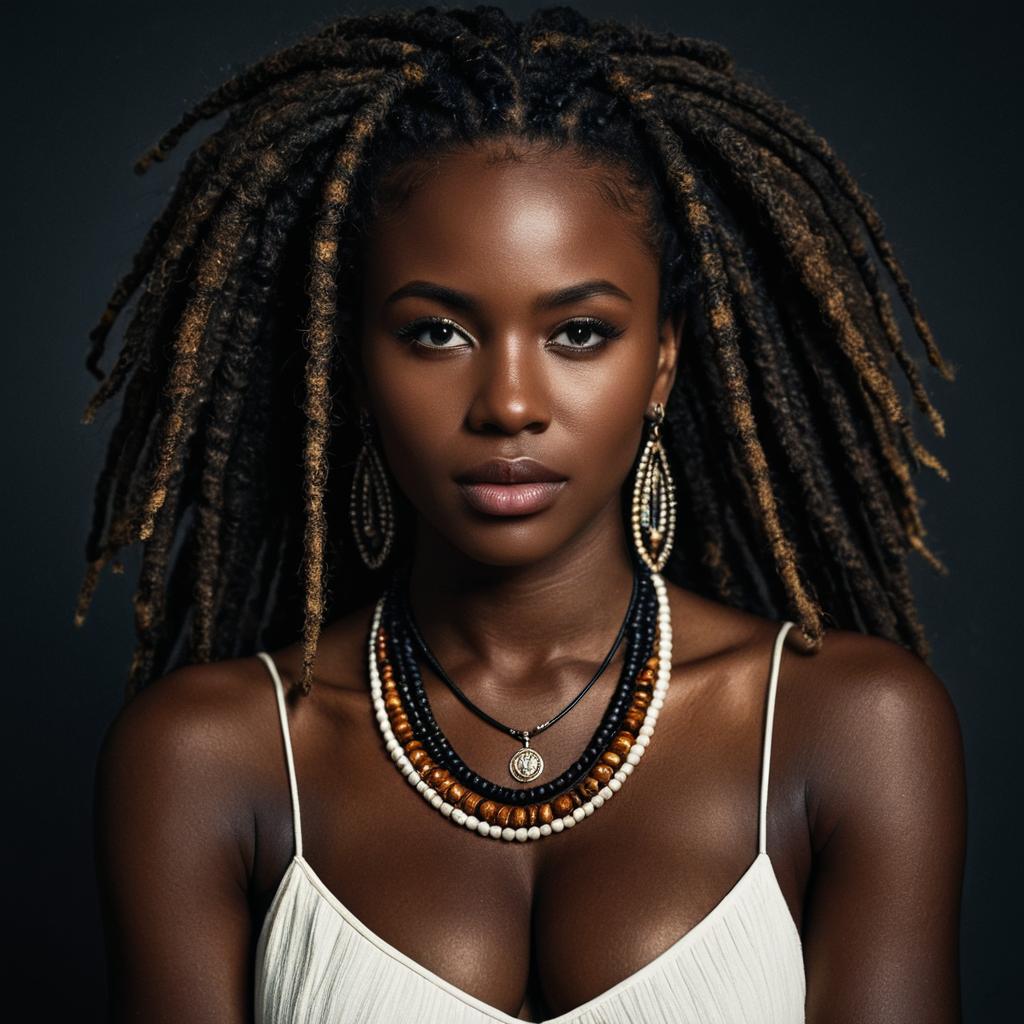 African hair style woman,1girl, solo, jewelry, breasts, dark skin, dark-skinned female, earrings, dreadlocks, cleavage, necklace, very dark skin, lips, medium breasts, realistic, brown hair, brown eyes