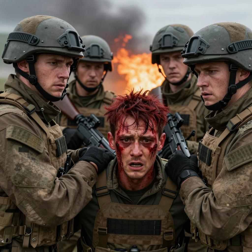 Photograph of four soldiers in combat gear, helmets, and uniforms, surrounding a scared man with messy red hair and blood on his face. Two soldiers on the left and right are gripping his shoulders, while another soldier in the background holds a rifle. A bright red flame burns in the background. The soldiers' faces show intense expressions. The man's face shows fear and desperation.