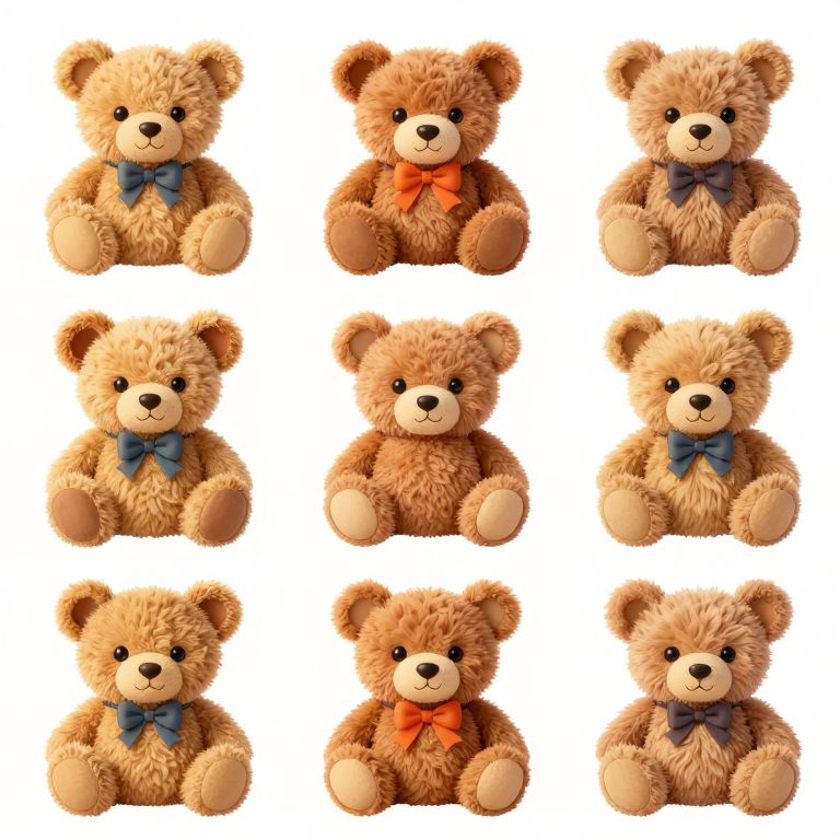 Photograph of nine identical, fluffy, light brown teddy bears with blue or orange bows, arranged in a 3x3 grid on a white