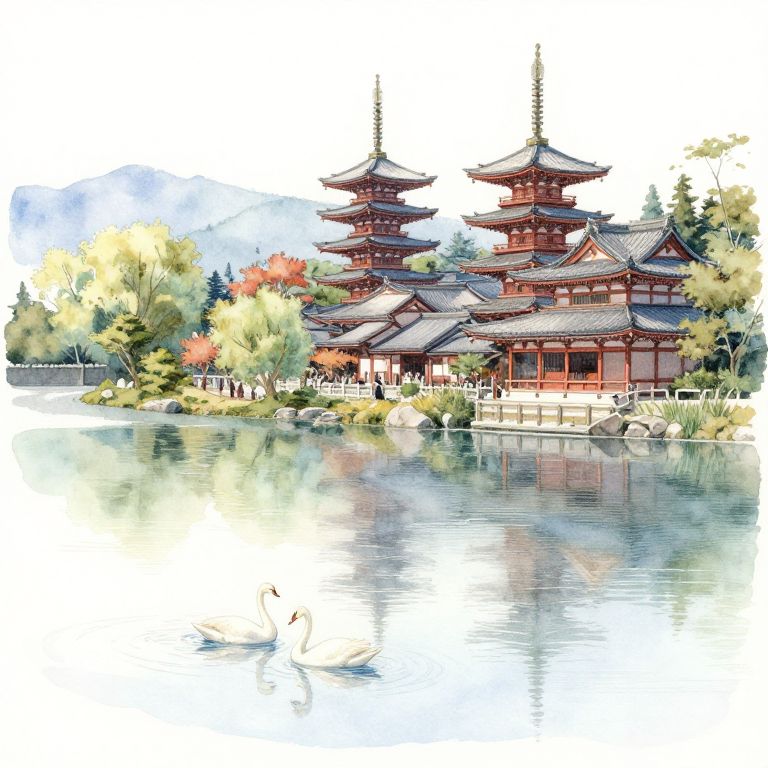 Japanese Pagodas by Lake with Swans Watercolor