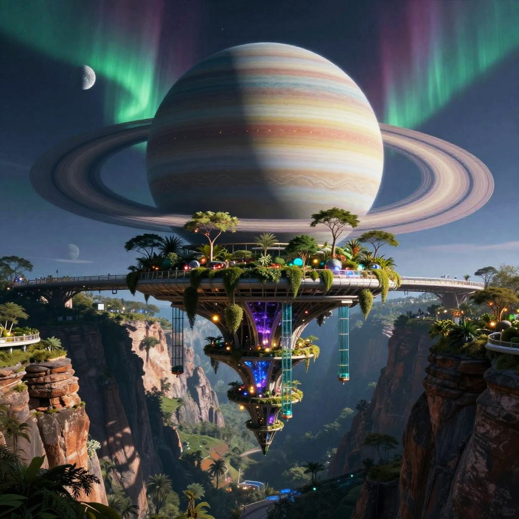 A stunning hanging canyon metropolis with a suspended bioluminescent hanging gardens and glass elevators set against a rim and terraces of a deep ringed-exoplanet canyon, featuring a vibrant backdrop of gigantic ringed gas giant dominating the sky with cascading auroras and silhouetted moons in the distance. This artwork is rich in detail, inspired by Feng Zhu, showcasing cinematic lighting and hyperrealism, rendered in 8K.