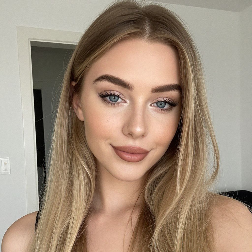 Photograph of a young woman with long, straight blonde hair, blue eyes, and full pink lips, smiling softly in a brightly lit room.