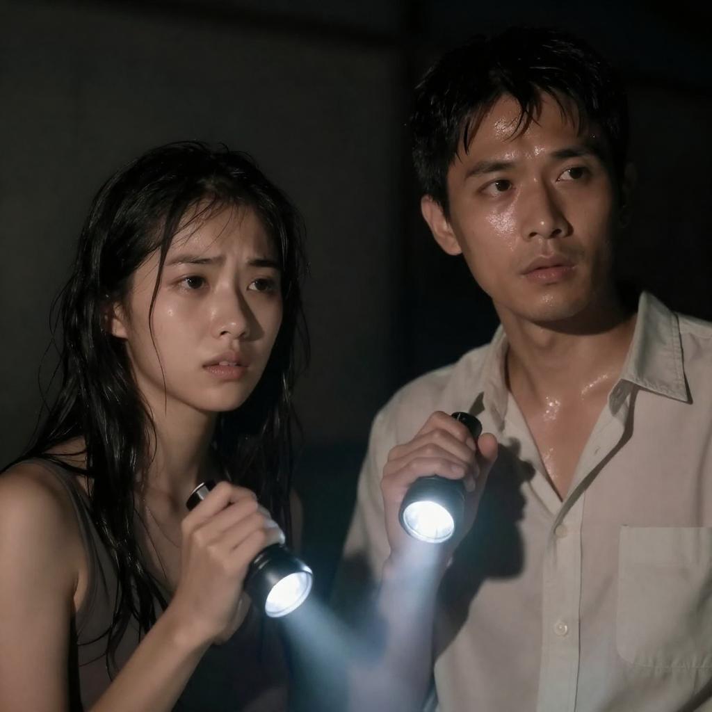 Photograph of a tense scene featuring a young woman with wet, dark hair and a concerned expression, wearing a sleeveless top, and a man with short, dark hair and a sweaty, light-colored shirt, holding a flashlight. They are illuminated by the flashlight's beam, with a dark, ured background. The man looks ahead, while the woman looks slightly to the side.