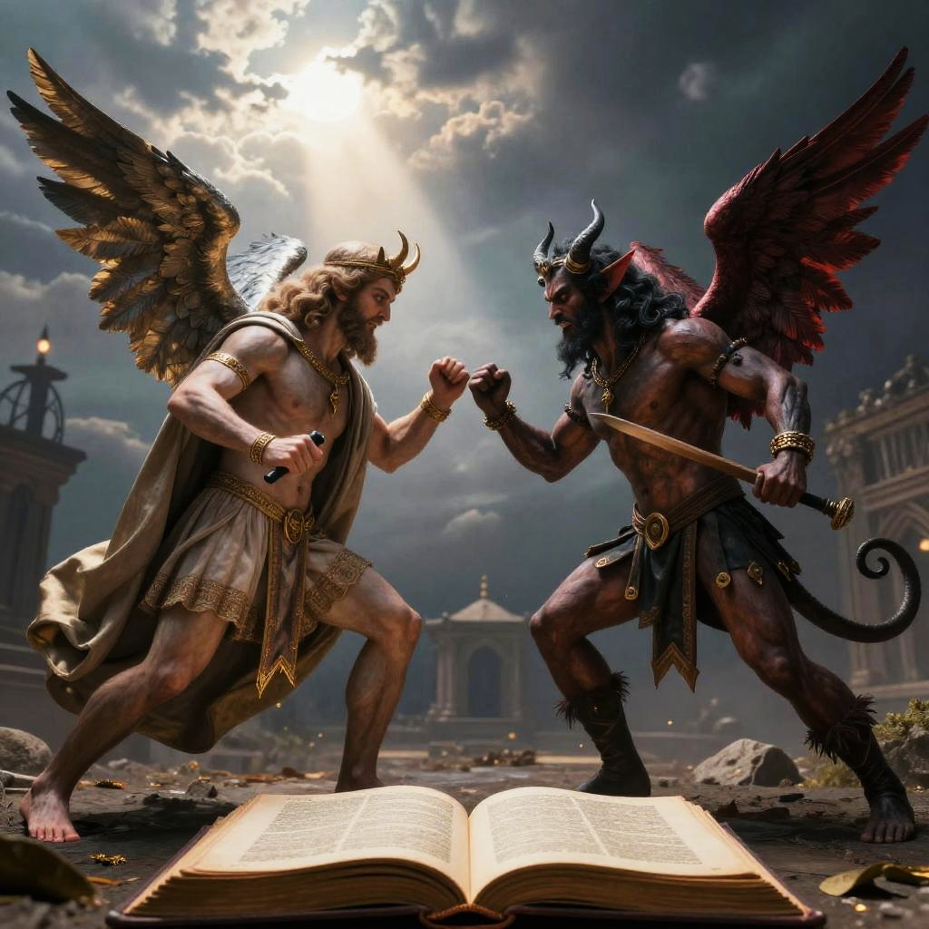 Digital artwork of two mythical figures, a muscular angel with golden wings and a bearded man wearing a beige, golden-trimmed tunic, and a dark-skinned, horned demon with red wings and black fur loincloth, standing face-to-face over an open glowing book in a sunlit, cloudy sky. The angel's left hand is raised, while the demon's right hand holds a sword. Background features ancient, classical architecture with columns and a dome. The scene is dynamic with intense lighting and dramatic shadows, evoking a confrontation between good and evil.