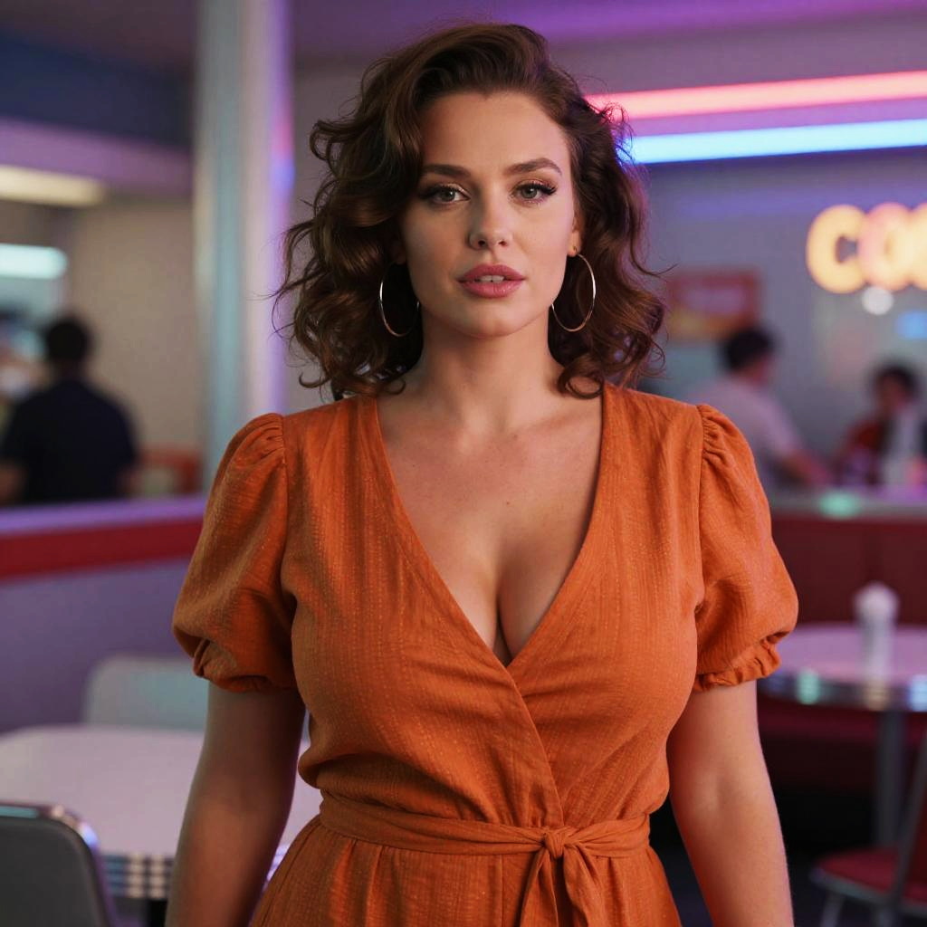 Photograph of a woman with wavy, dark brown hair and fair skin standing in a retro-style diner. She wears a deep V-neck, orange, short-sleeved dress that accentuates her cleavage. She has hoop earrings and a confident expression. The background features blurred neon lights, tables, and chairs, with a few indistinct figures seated. The lighting emphasizes her face and dress, creating a warm, nostalgic atmosphere. The image has a slightly soft focus, adding to the vintage feel.