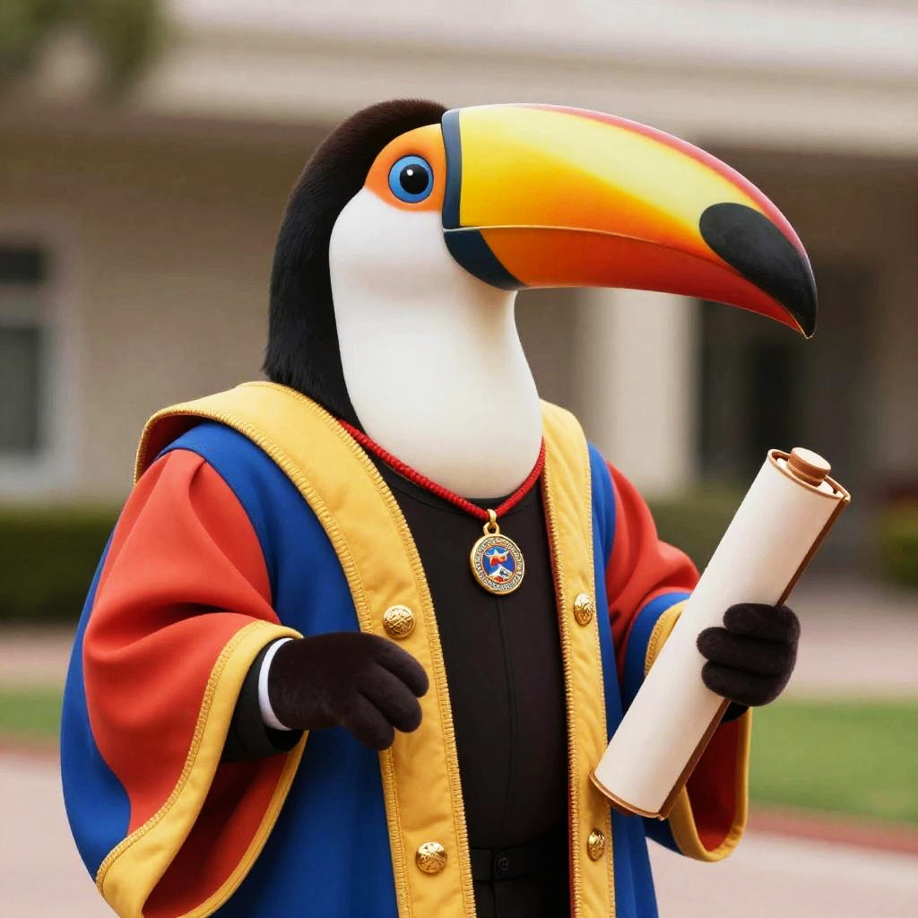 Anthropomorphic toucan depicted as a president, wearing colorful diplomatic robe, with a folded scroll in one hand and a diplomatic smile.