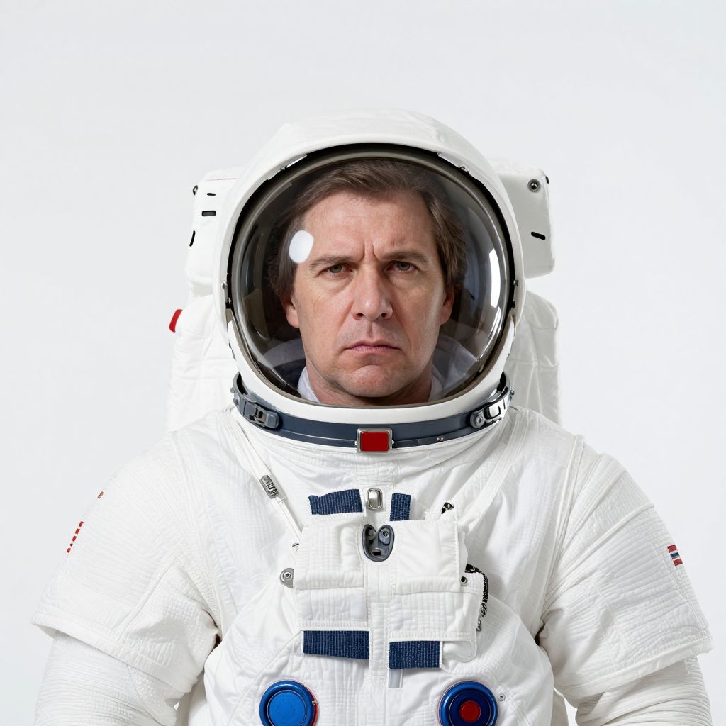 Photograph of a middle-aged Caucasian man with short brown hair, wearing a white astronaut suit with a large, round, clear helmet. The suit has blue and red circular buttons on the chest, black straps, and a reflective visor showing his serious expression. The background is pure white, making the astronaut suit and the man's face the focal points. The image is sharply detailed, emphasizing the texture of the suit's material and the man's slightly furrowed brow. The lighting is even, highlighting the suit's white color and the man's features clearly.