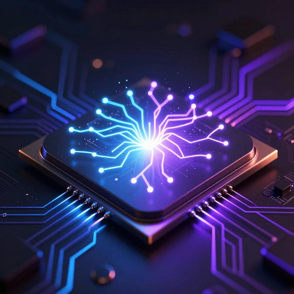 Stable diffusion for AMD technology visualized as a futuristic GPU chip emitting vibrant neural network patterns, set against a sleek dark high-tech background, glowing circuits in blue and purple hues.