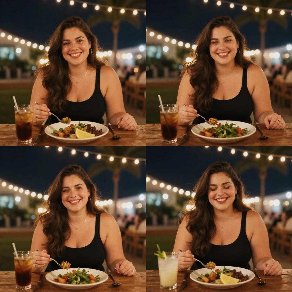 Photograph of a smiling woman with long dark hair in a black tank top, eating salad and iced drinks, string lights in background, four-panel