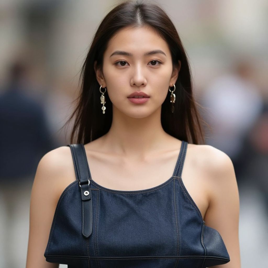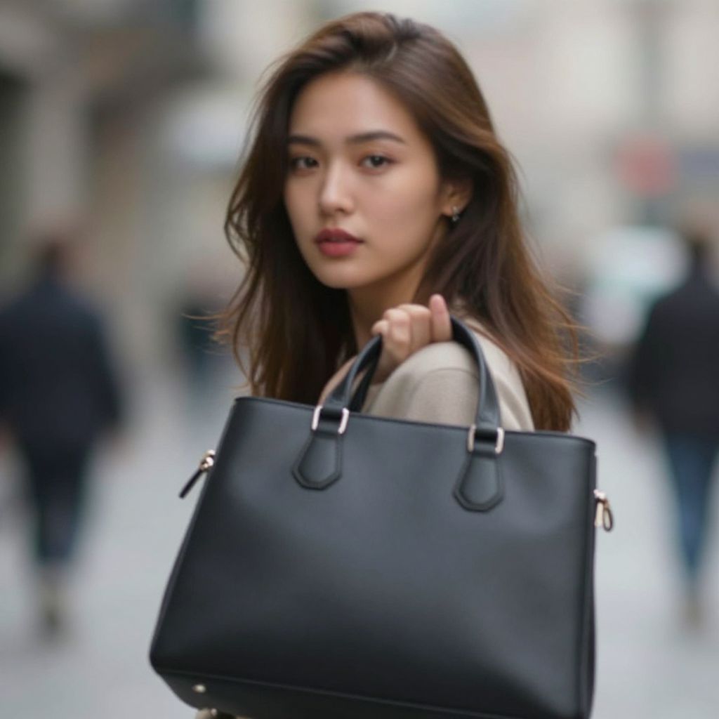 Photograph of an Asian woman with long, wavy brown hair and fair skin, standing in a blurred, urban street background. She has full lips with dark red lipstick and is wearing a light-colored coat. She holds a sleek, black leather handbag with silver hardware in her right hand, raised slightly in front of her. Her expression is neutral, and she gazes directly at the camera. The background features indistinct figures and buildings, suggesting a bustling city environment. The image has a shallow depth of field, focusing on the woman while the background remains out of focus.