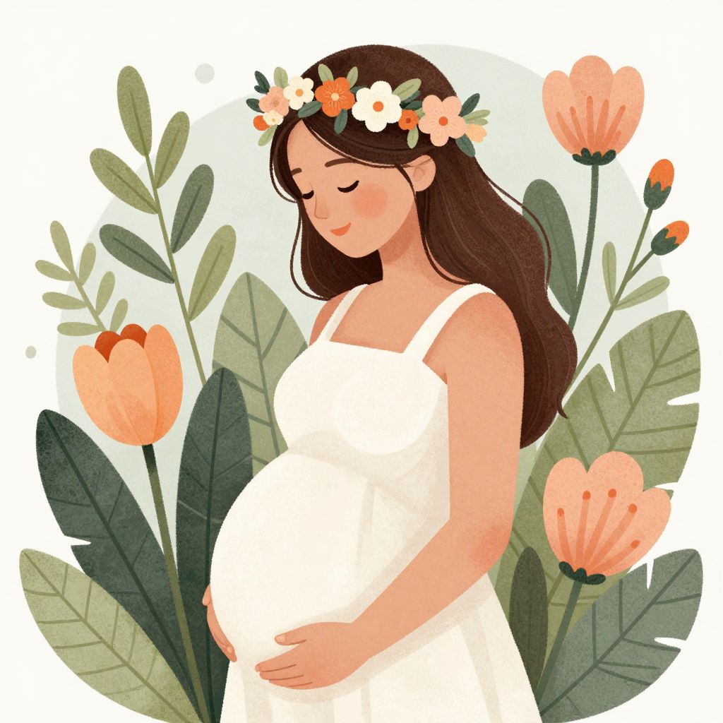 Digital illustration of a pregnant woman with long brown hair, a floral crown, and a white dress, standing among large green leaves and orange flowers, smiling