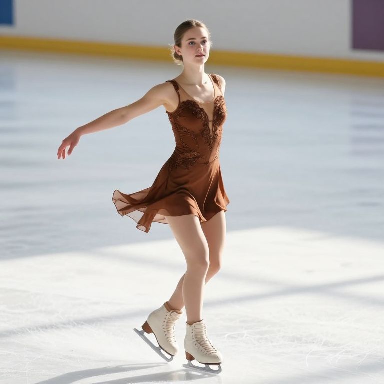 A realistic photograph of a young female figure skater in a brown figure skating dress, the dress flowing smoothly with movement, showing intricate lace detailing and a fitted cut that highlights her toned figure. She is standing on ice in a well-lit rink with soft morning light casting shadows, wearing a dark blonde hairstyle and bright blue eyes, expression focused and confident.