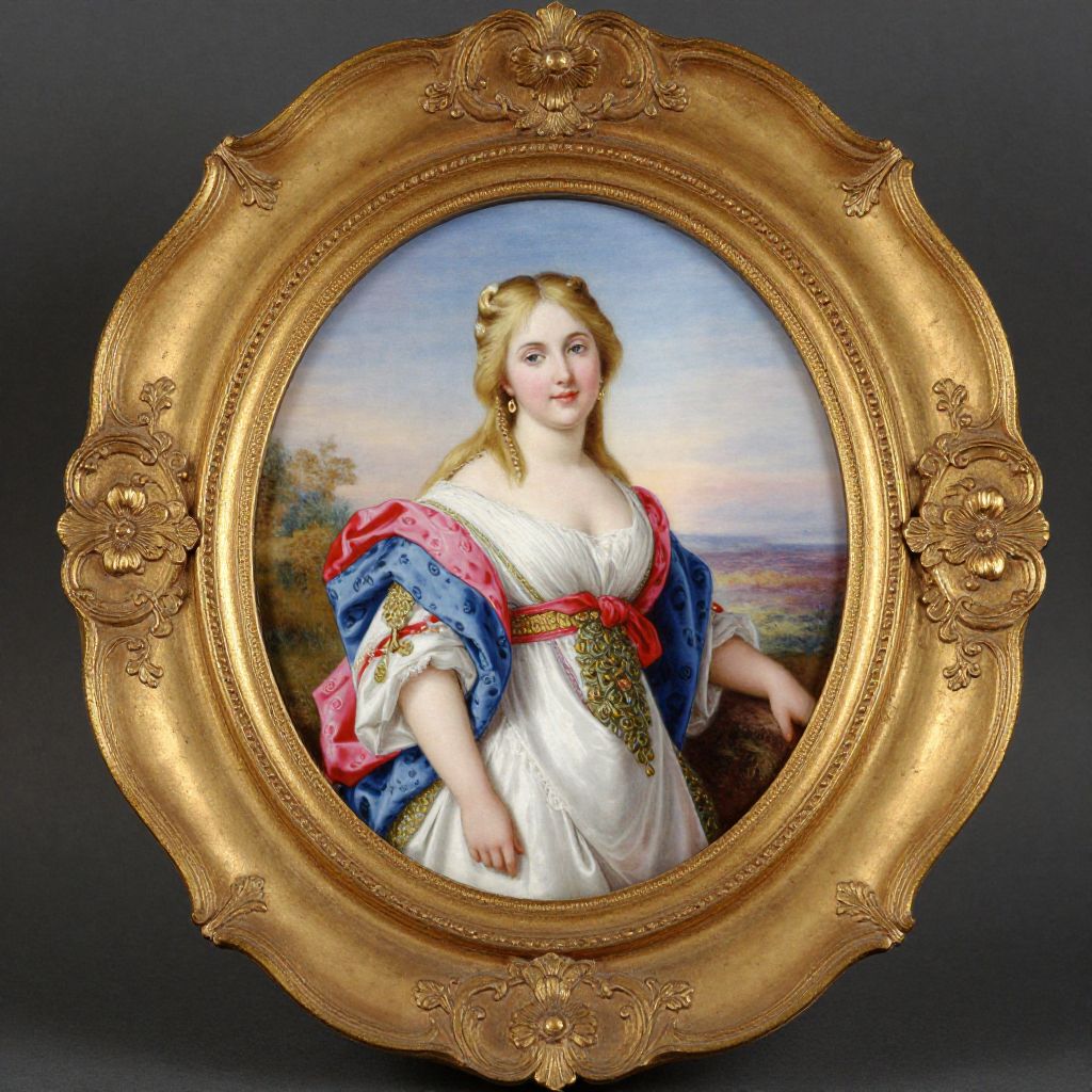Exquisitely framed 19th-century oval portrait on porcelain depicts a cherubic young woman with golden hair, dressed in a vibrant ensemble of white, pink, and blue, set against a serene sky backdrop, encased in an ornate gold frame with intricate floral detailing.