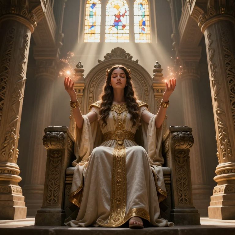 Photorealistic digital artwork of a regal, dark-haired woman with fair skin, sitting on an ornate golden throne in a dimly lit, grand cathedral. She wears a flowing, white and gold embroidered robe with wide sleeves, and a golden crown. Her arms are raised, each hand holding a small, glowing orb of light. The cathedral features tall, intricately carved columns and a large, colorful stained glass window behind her, through which beams of sunlight illuminate the scene. The atmosphere is mystical and majestic, emphasizing her divine or magical presence.