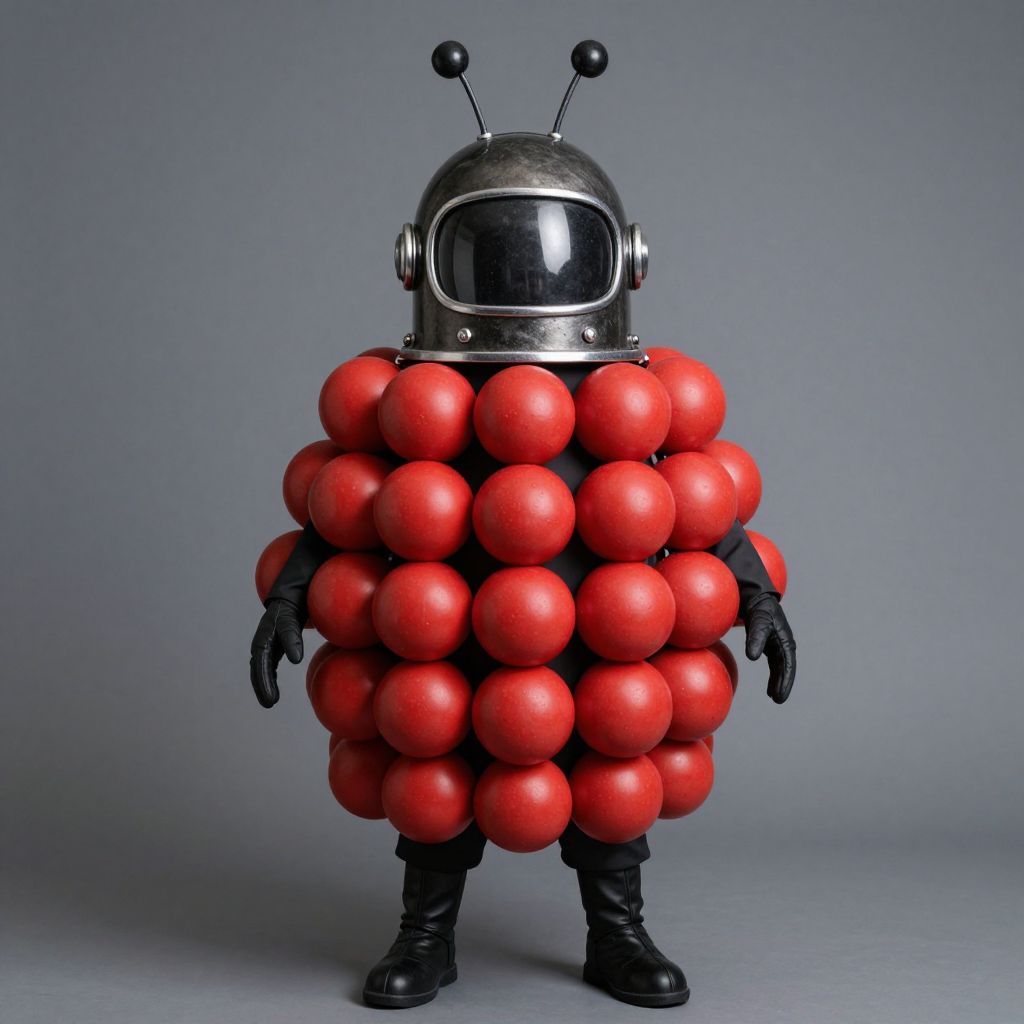 Photograph of a person dressed in a quirky, retro-inspired costume. The costume features a metallic silver helmet with antennae and a transparent visor. The torso is covered in a grid of large, bright red, spherical foam balls, giving a bumpy texture. The person's arms are clad in black gloves, and they wear black boots. The background is a simple, gradient gray, which highlights the colorful costume. The overall style is playful and futuristic, combining elements of space and sci-fi fashion. The image has a clean, studio-lit look.